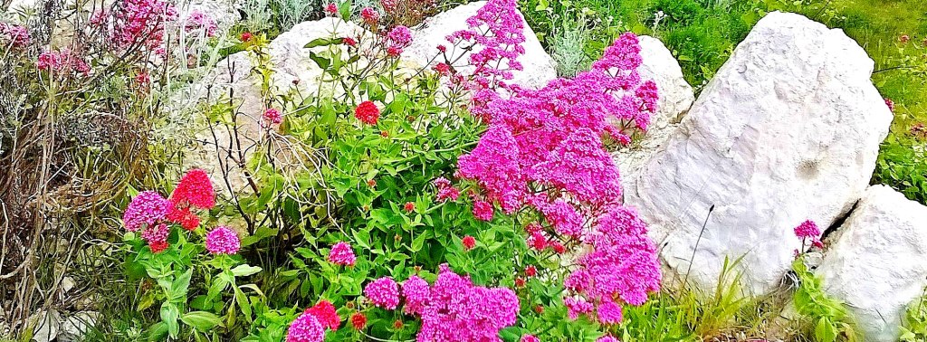The pink and red flowers look lovely against the green and white. Are they Red Valerian? We get them growing on the cliffs here, but they don’t look as impressive without the white background.