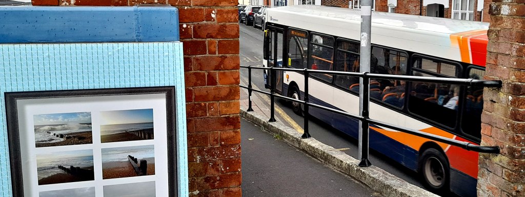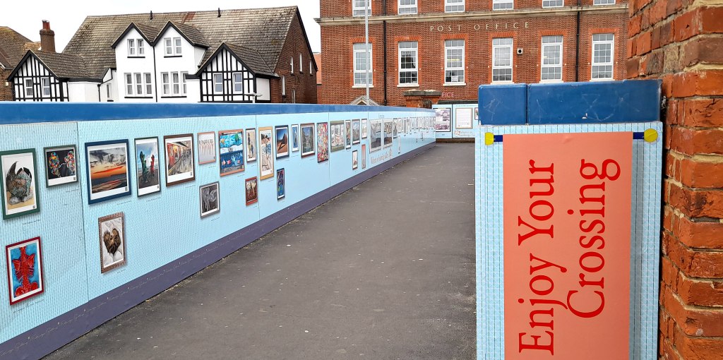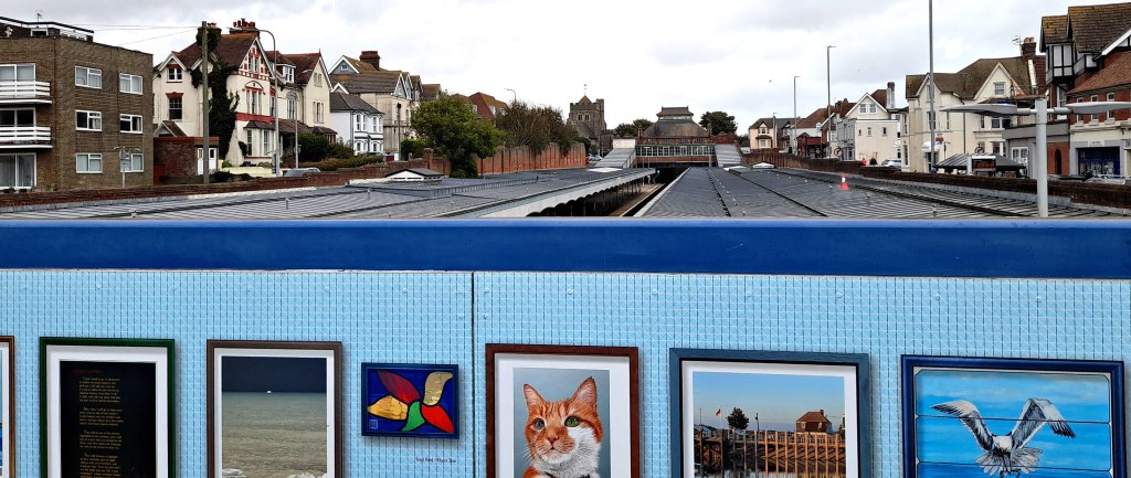 Three or so years ago, someone in our town came up with the bright idea of turning the bridge that crosses the railway station into an art gallery! Local artists were invited to submit works to be displayed. Every now again the pictures are changed. I brightened up this miserable morning by taking a few snaps to show you!.